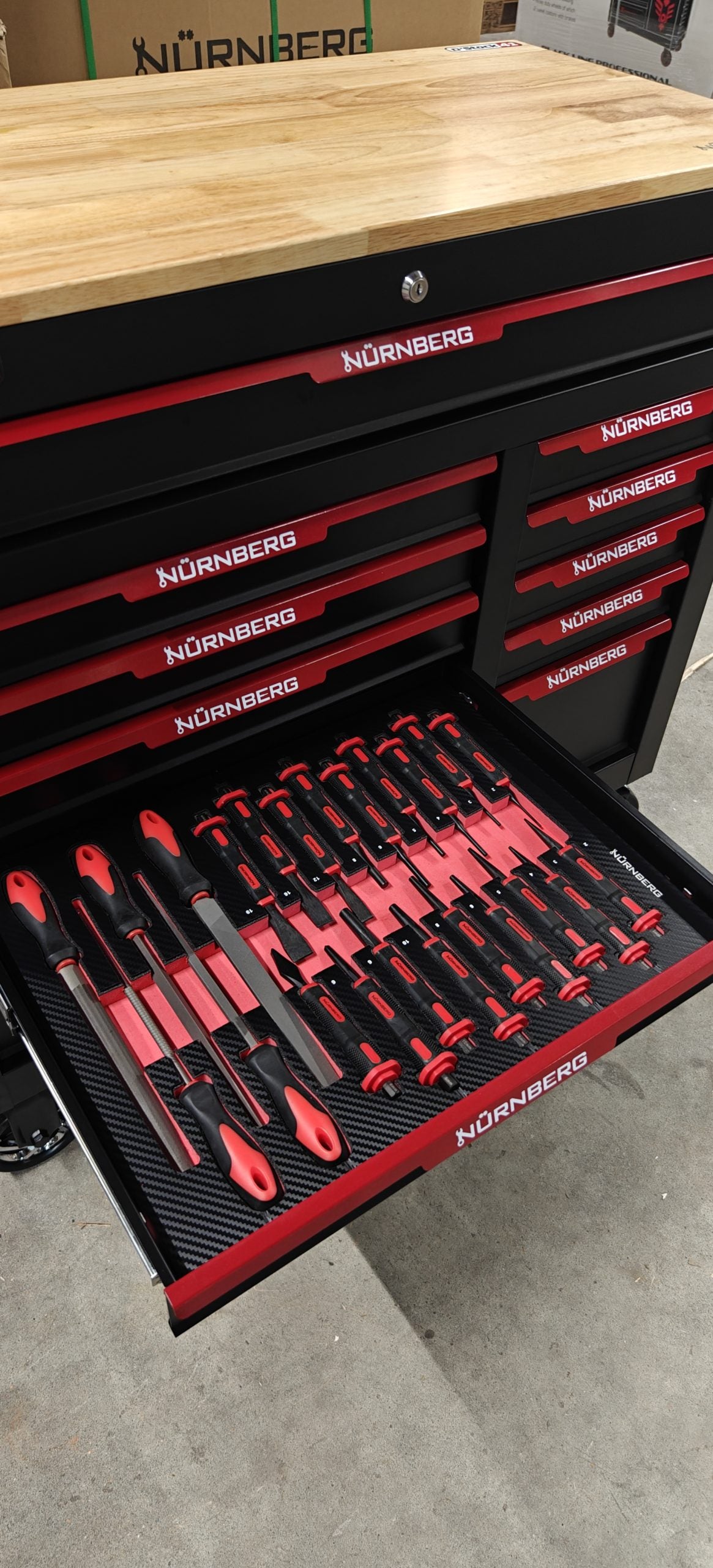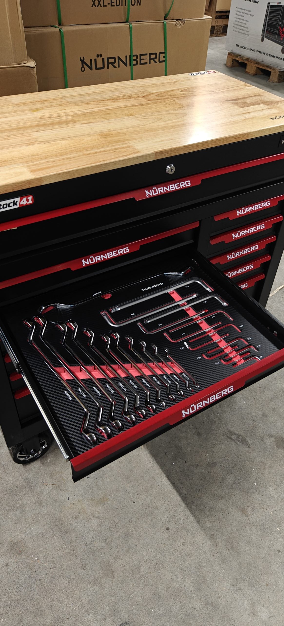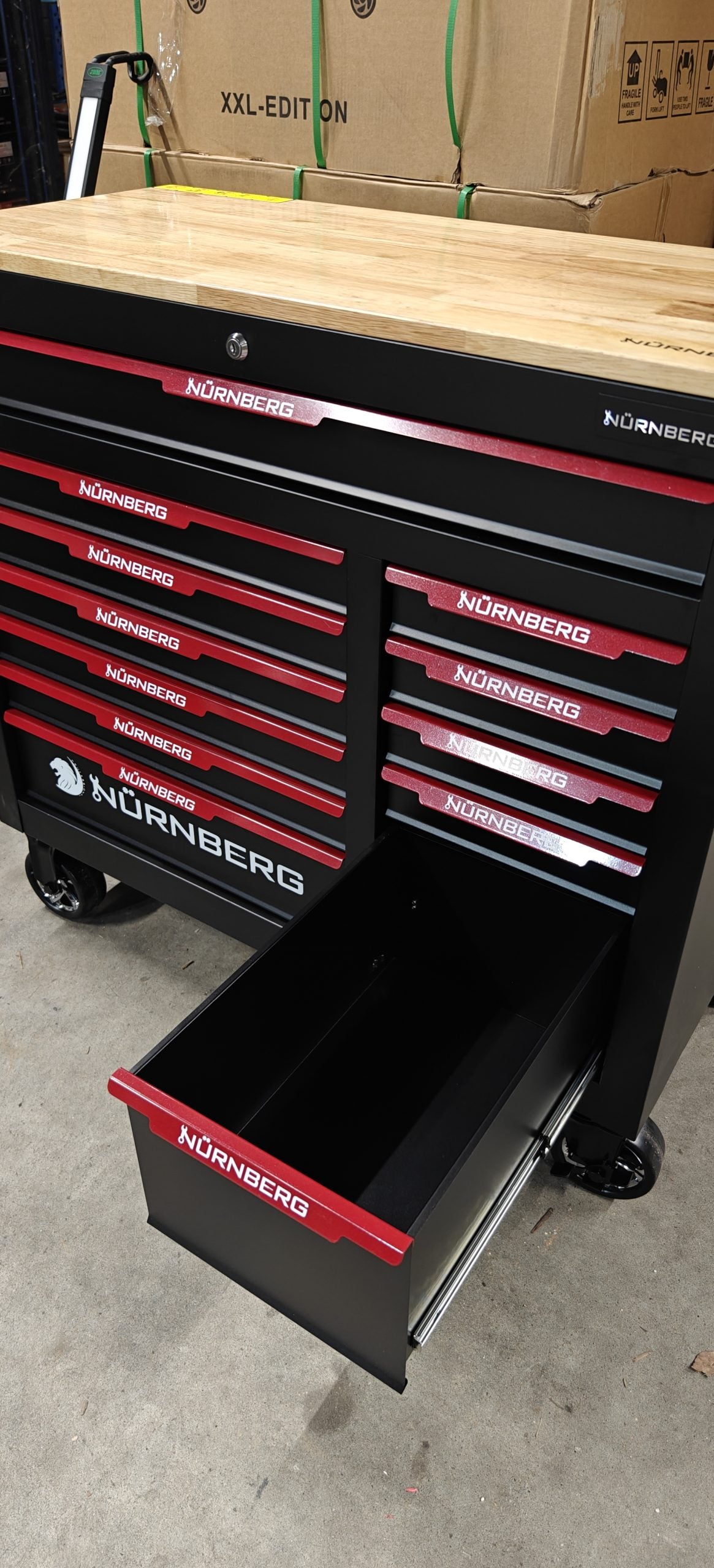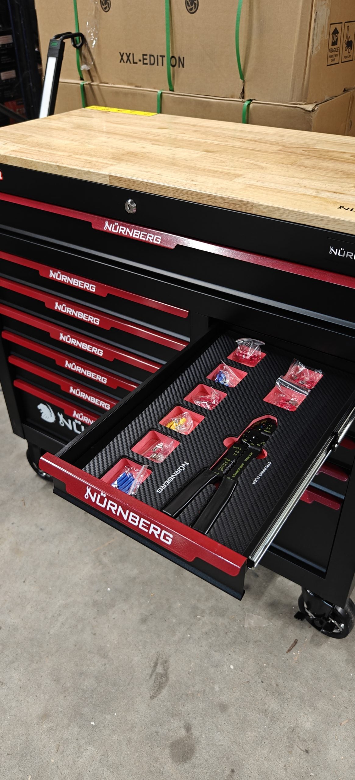 Equipped with a wooden top tray and 10 tooled drawers out of 12, this XXL workshop trolley is an essential for your garage or workshop.