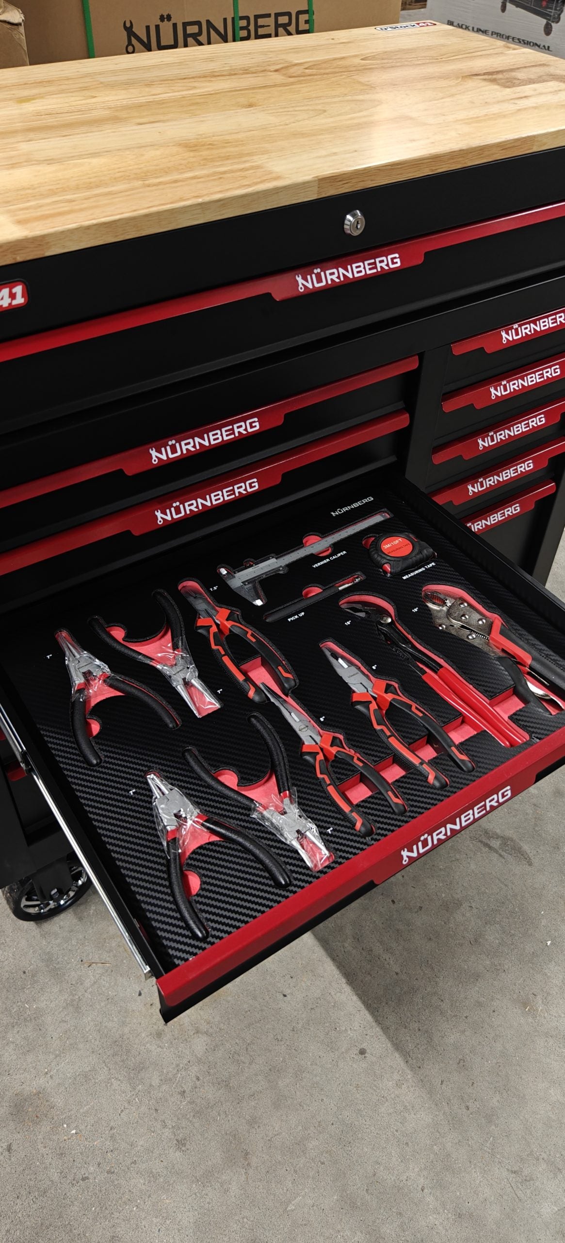 6th drawer: Assortment of various circlip pliers + angled long-nose pliers + multigrip pliers + locking pliers, caliper + 3m measuring tape + telescopic magnetic pickup tool